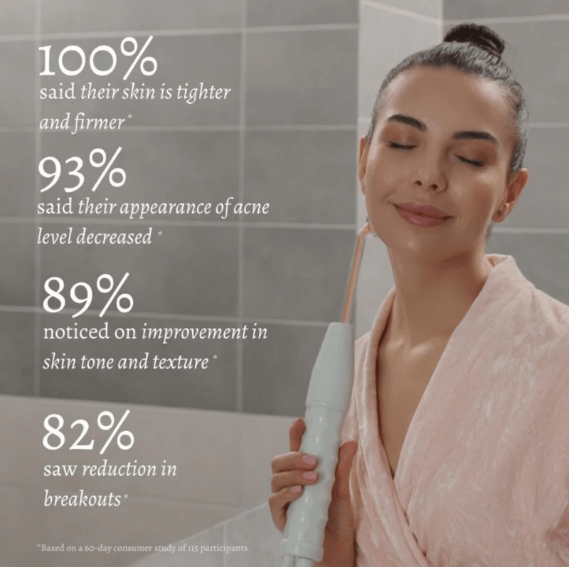 The wand uses gentle electrical current with either neon or argon gas — neon creates oxygen to kill surface bacteria, while argon produces a small amount of UV light to target deeper breakouts. Together, they help clear skin and calm inflammation naturally.